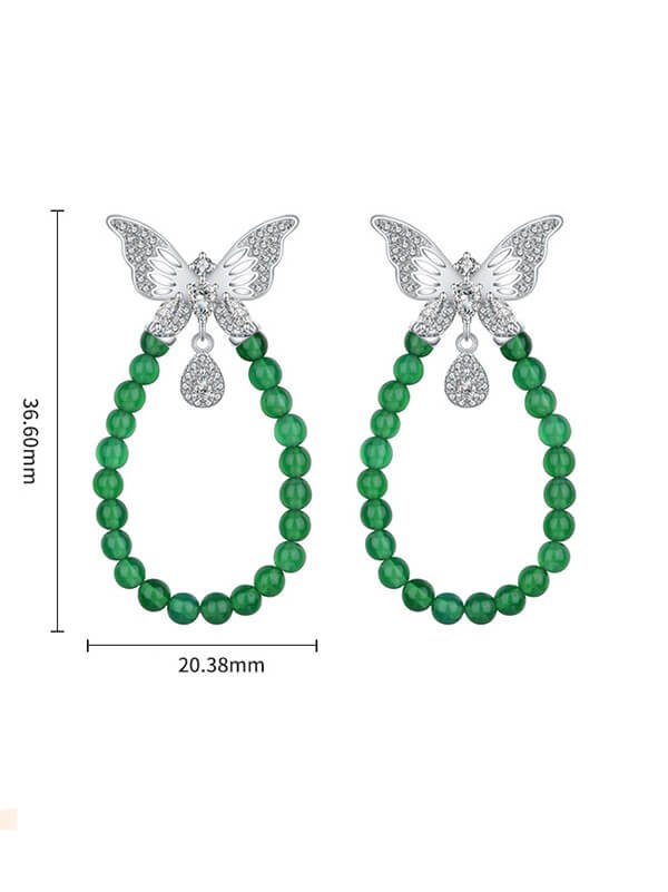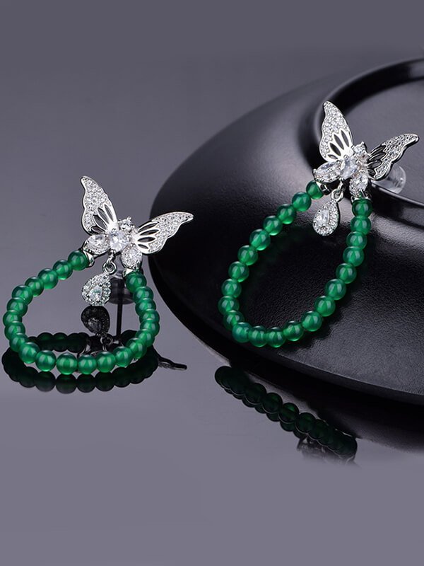 Silver Butterfly Earrings with Natural Green Chrysoprase and Zircon